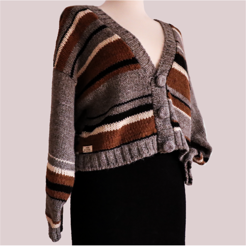 Chompa cárdigan franjas con pretinas rib cadera detalle de los botones de cerámica bordados material color, hilado 100% pura fibra de Alpaca regenerativa hilado titulo 1/9.