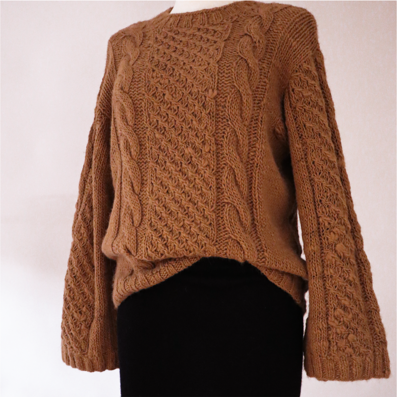 Chompa jersey cuello “O” pretinas rib hecho a mano número de palitos 3.5 con punto malla y trenzas y/o sogas manga ensanchada material 100% pura fibra de alpaca regenerativa.